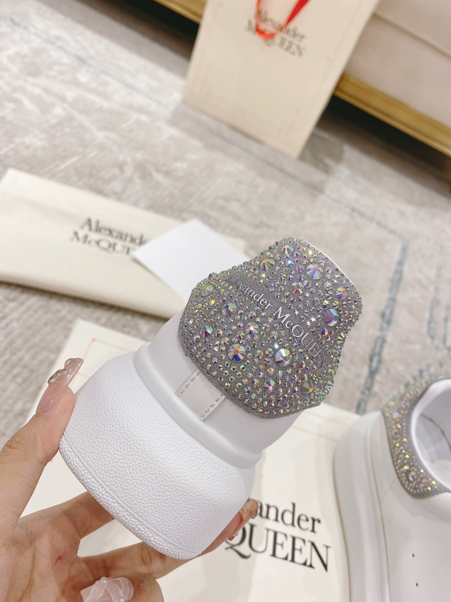 Fancy diamond tail ?? Alexander McQ?23ss classic white sneakers, made by McQueen for six consecutive years, the newly upgraded version is available at the counter simultaneously The latest original top-tier version developed this year - the couple version ... ?? McQueen M, CQ, as ALWAYS exclusive mold fabric material, LOVE to put down, correct fit, absolutely wonderful to wear, super COMFORTABLE ?????? Our company may not be the earliest to produce bulk goods, but we have always been providing you with the best quality products. We are dedicated to making the best quality! McQueen's top purchasing version for spring, summer, autumn and winter ... ? Classic + FASHION + VERSATILE + GRAND + ELEGANT + HIGH FASHION ???? STAR PREFERRED, ONE of the essential, many color options ??? ?? Fabric: Exclusive molded beige imported silk cowhide The upper of the shoes is custom-made with imported anti-stain features. TPU+PU anti-yellowing. Super strong sense of temperament ?? Lining: imported grade A water-dyed sheepskin (price equal to cowhide lining) ?? Sole: Counter original mold rubber TPU sole The thick-bottomed 4.5cm men's and women's grinding tools have different lasts ?? with counter original publication (original beige shoebox.) Cloth bag. Handbag. 4-piece set with 1:1 mold for matching certificate. Deliver a pair of shoelaces ?? For men and women size: 35-40 for females, 39-44 for males (Size change only) 102035 [Male code plus 10] Note: Special sizes: Female 34.40.41, male 38.45.46. Custom-made available. Return. Exchange McQueen's tail has too many colors. Special style, special color, special tail. The air cushion series Velcro is custom-made and non-returnable. It's normal for the tail fabric of the colored style to have some differences in light and dark colors. Thank you [handshake][Handshake][Handshake]