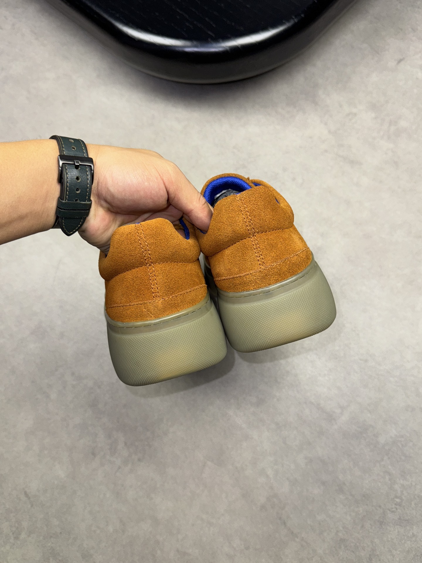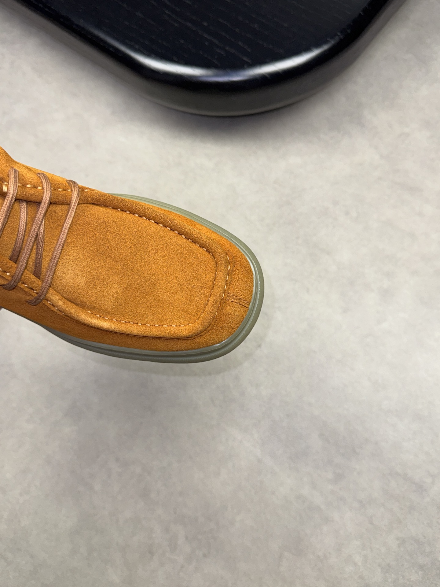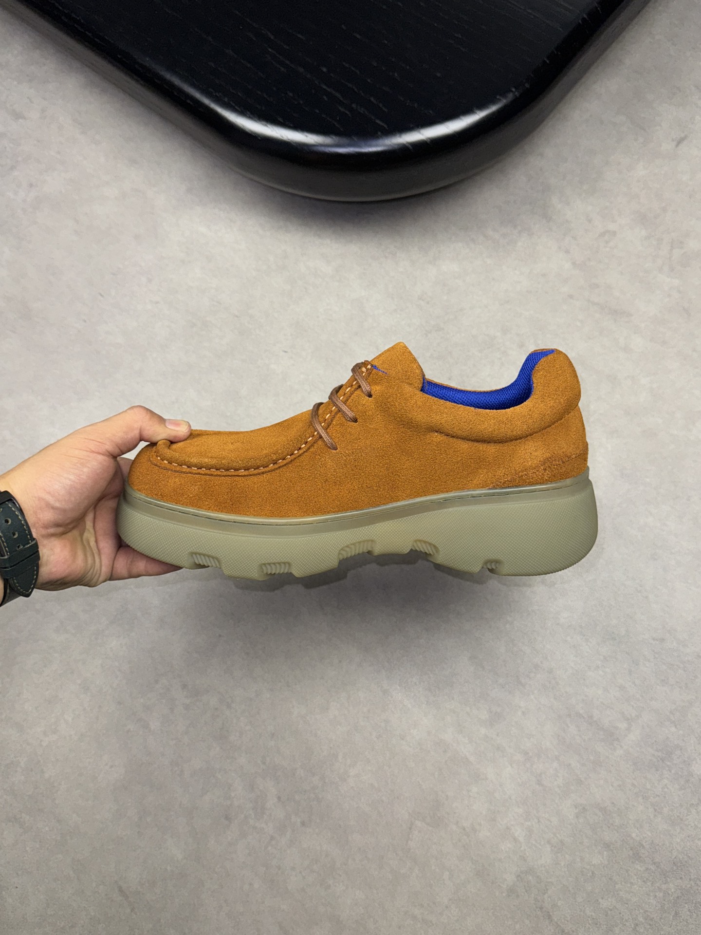 - Upper: ?? fleece calfskin with hand-stitched marking