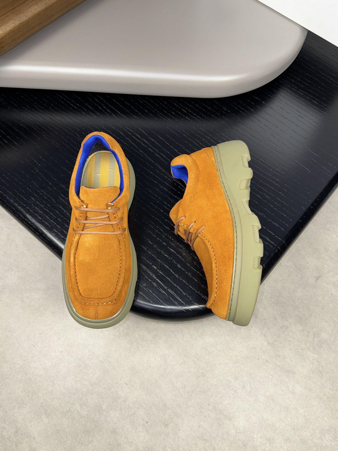 - Upper: ?? fleece calfskin with hand-stitched marking