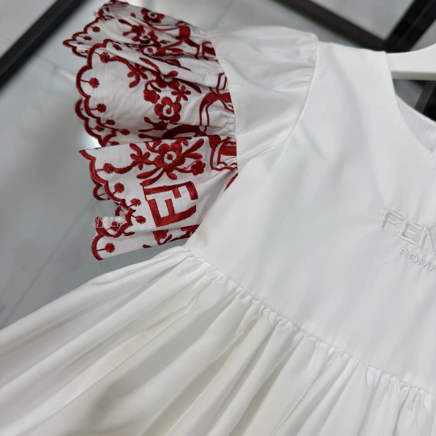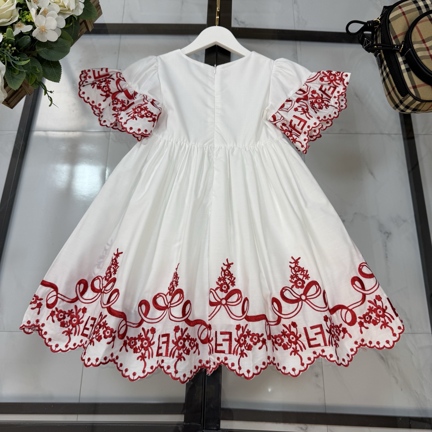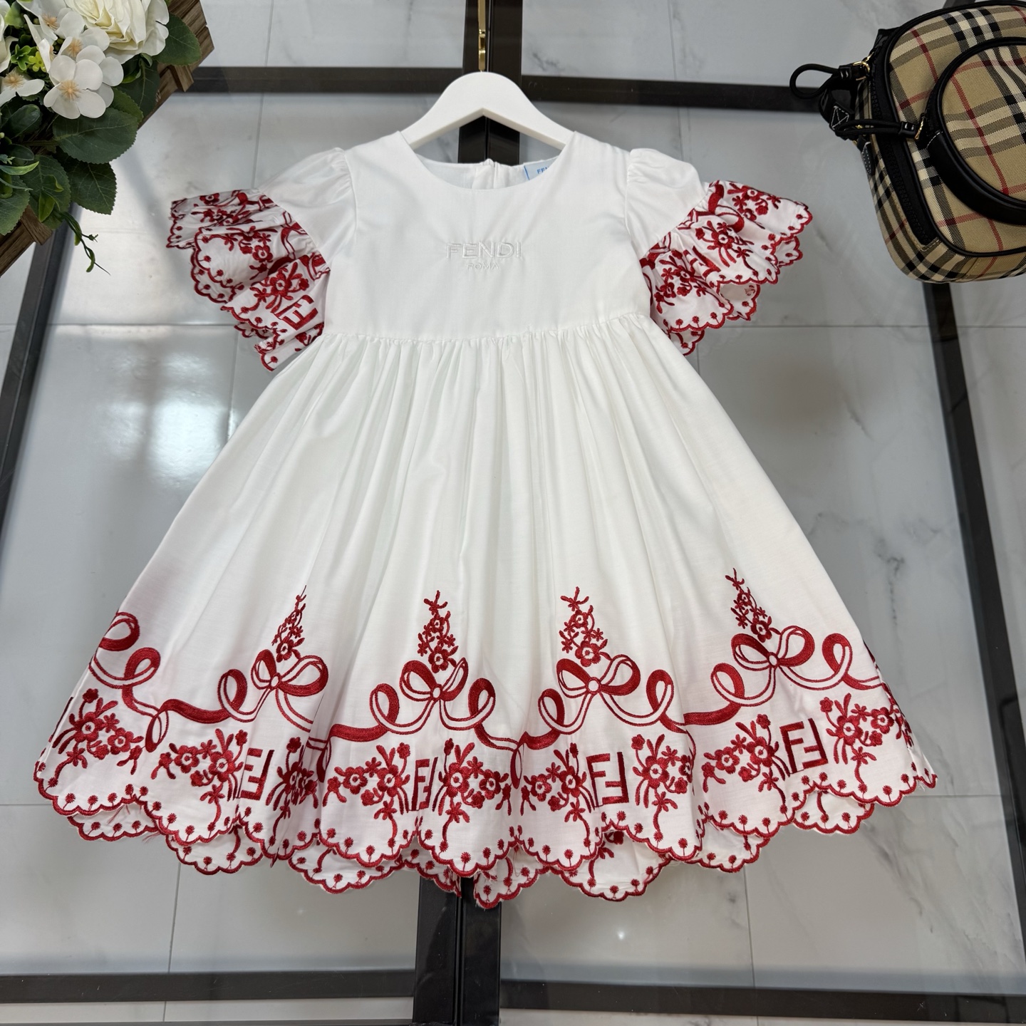 Fendi, high-end children's clothes, girls dress, double layer design, outer woven cotton, cotton, inner outer skirt FF embroidery ?? wine red color, body comfortable, good-looking, code number: 100/110/120/130/140/150 cm