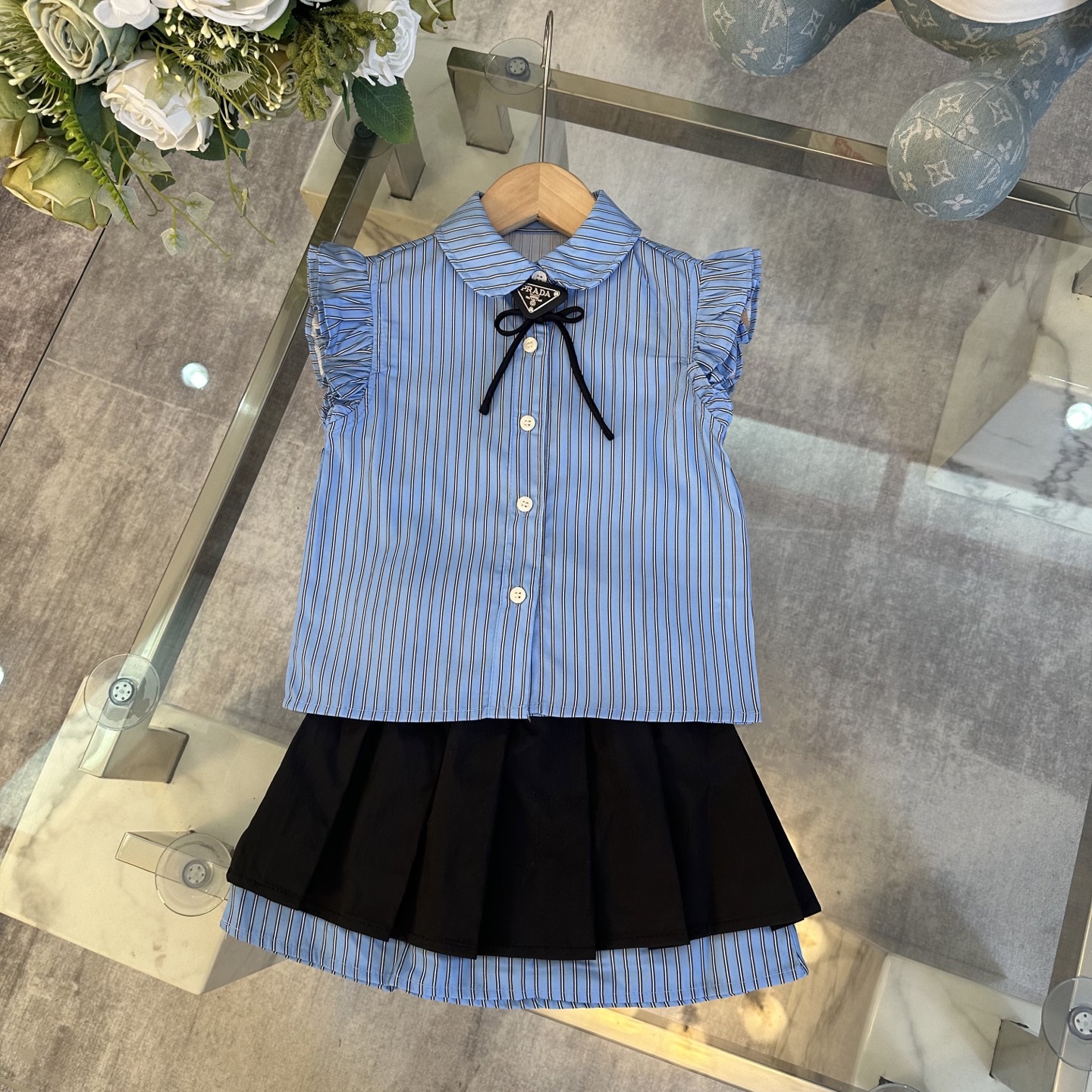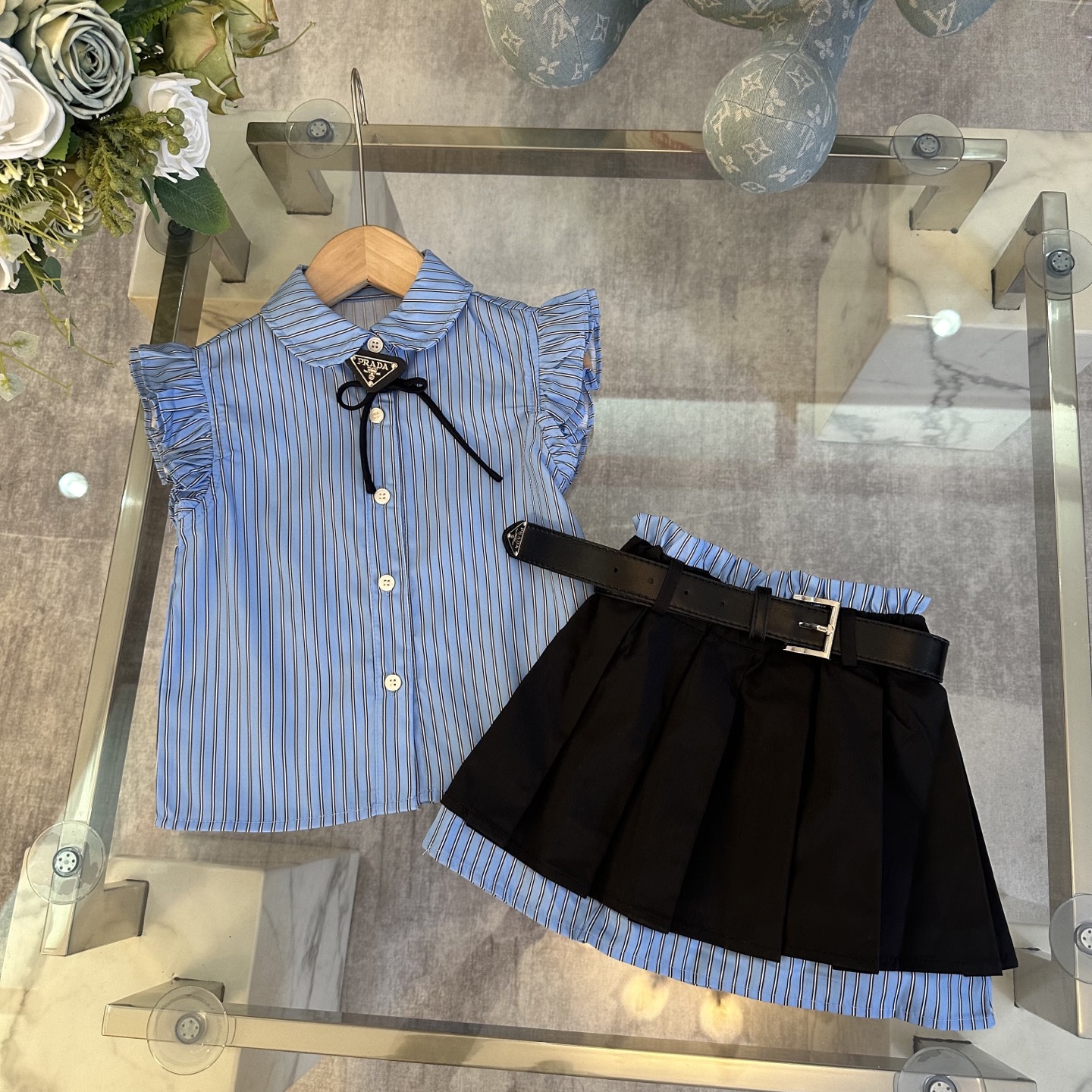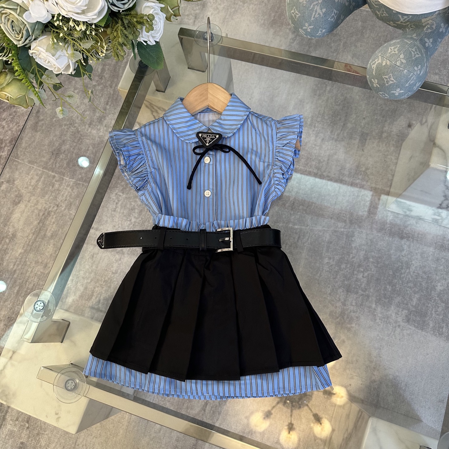 Prada, high-end children's wear, the girl's skirt, shirt + pleated skirt, belt design, pure cotton fabrics, upper body comfortable, good-looking, code number: 100/110/120/130/140/150 cm