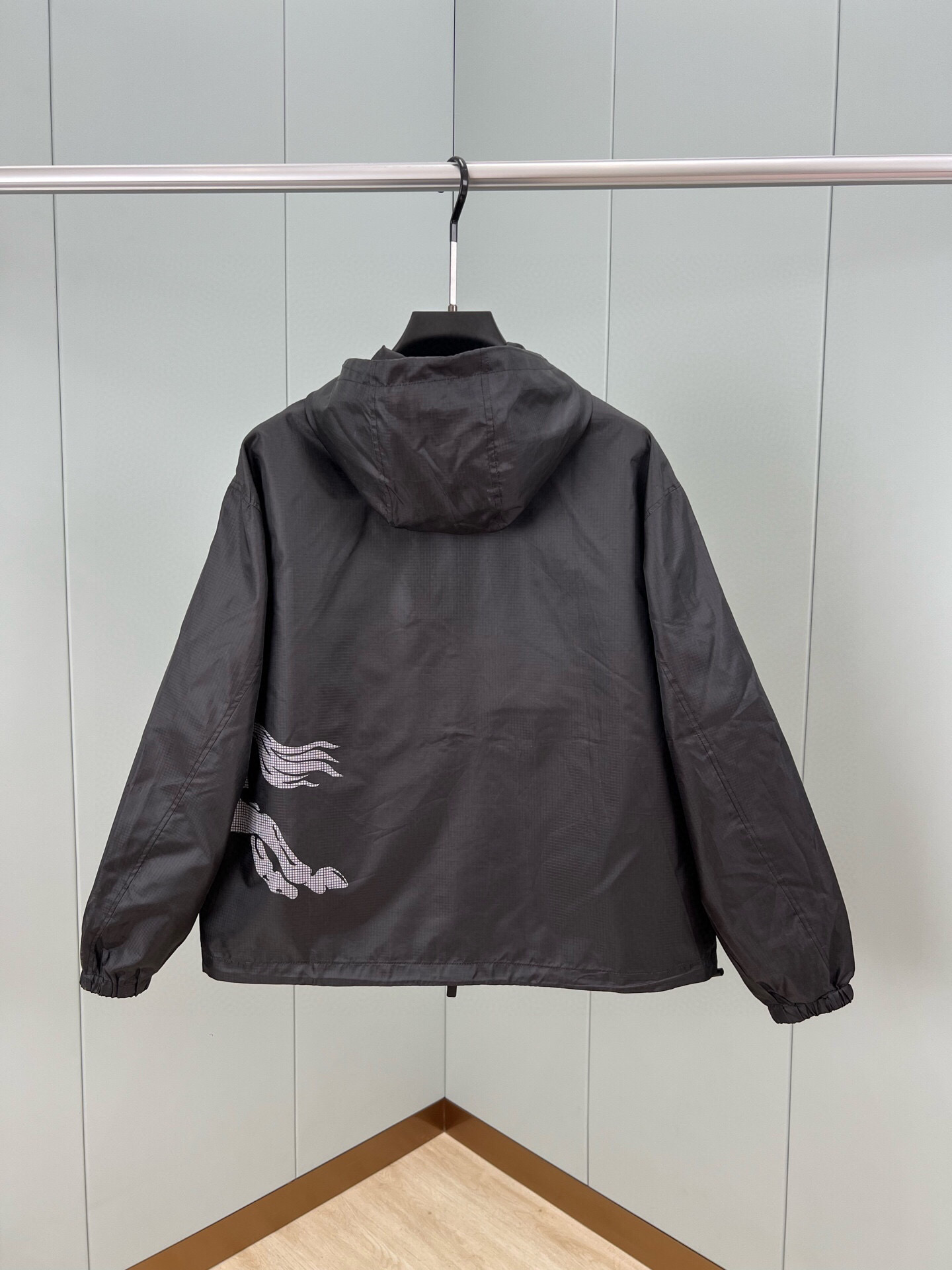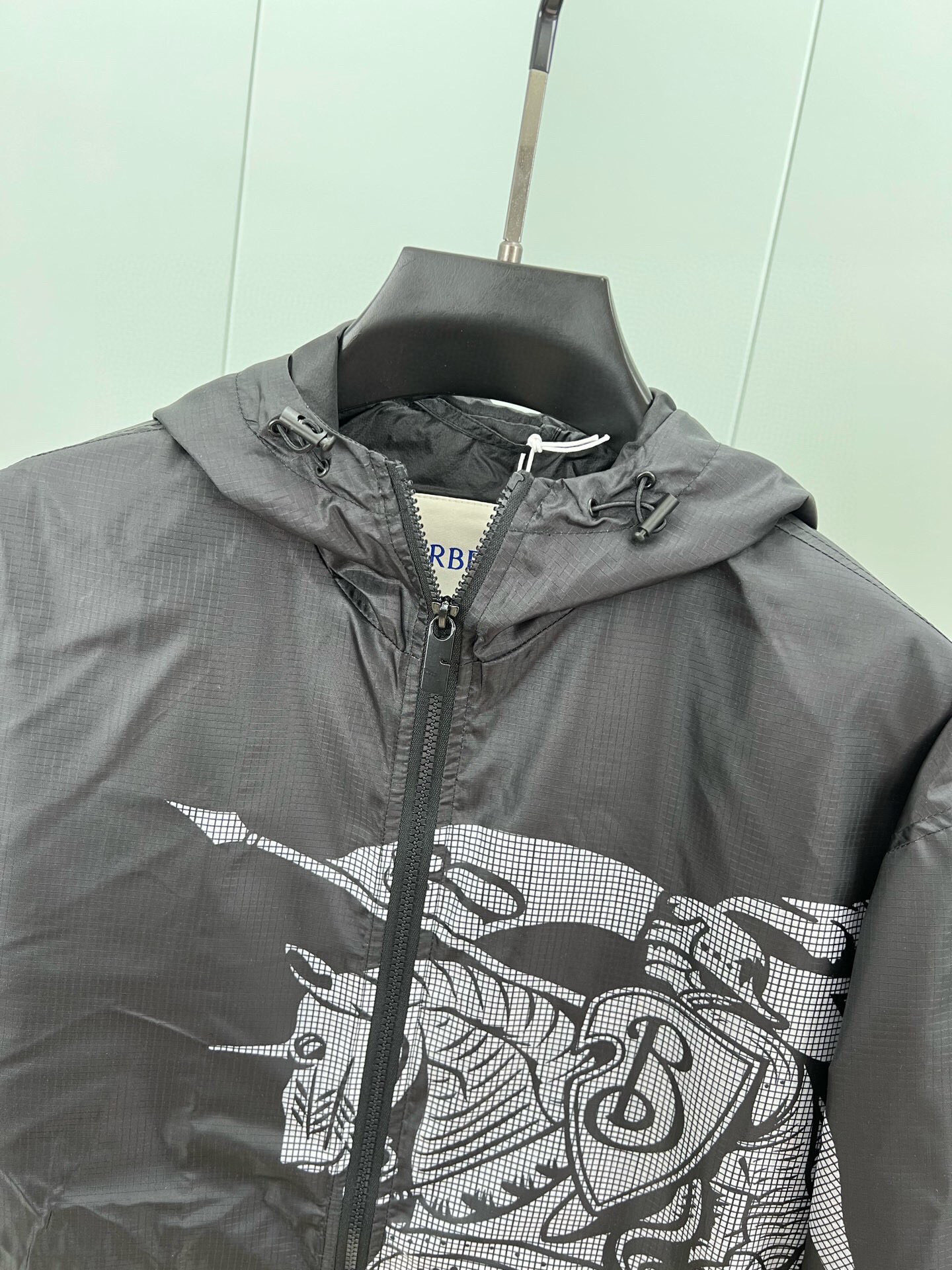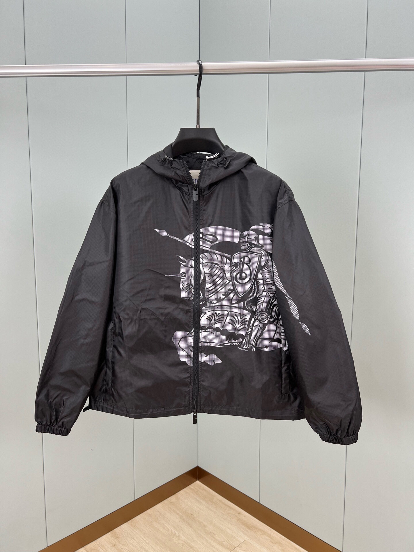 BURBERRY's Spring/Summer 25 new men's Equestrian Knight logo nylon windbreaker jacket features a positioning print of the equestrian knight logo on the front, positioning laser cutting, and a loose fit. It is equipped with a B-shaped zipper pull, bidirectional zipper opening and closing, a drawstring hood and hem, side zipper pockets, and elastic cuffs. Both the outer and inner layers are made of nylon fabric, offering a full range of styles. Black size: M ~ XXXL. Please report your height and weight when placing an order