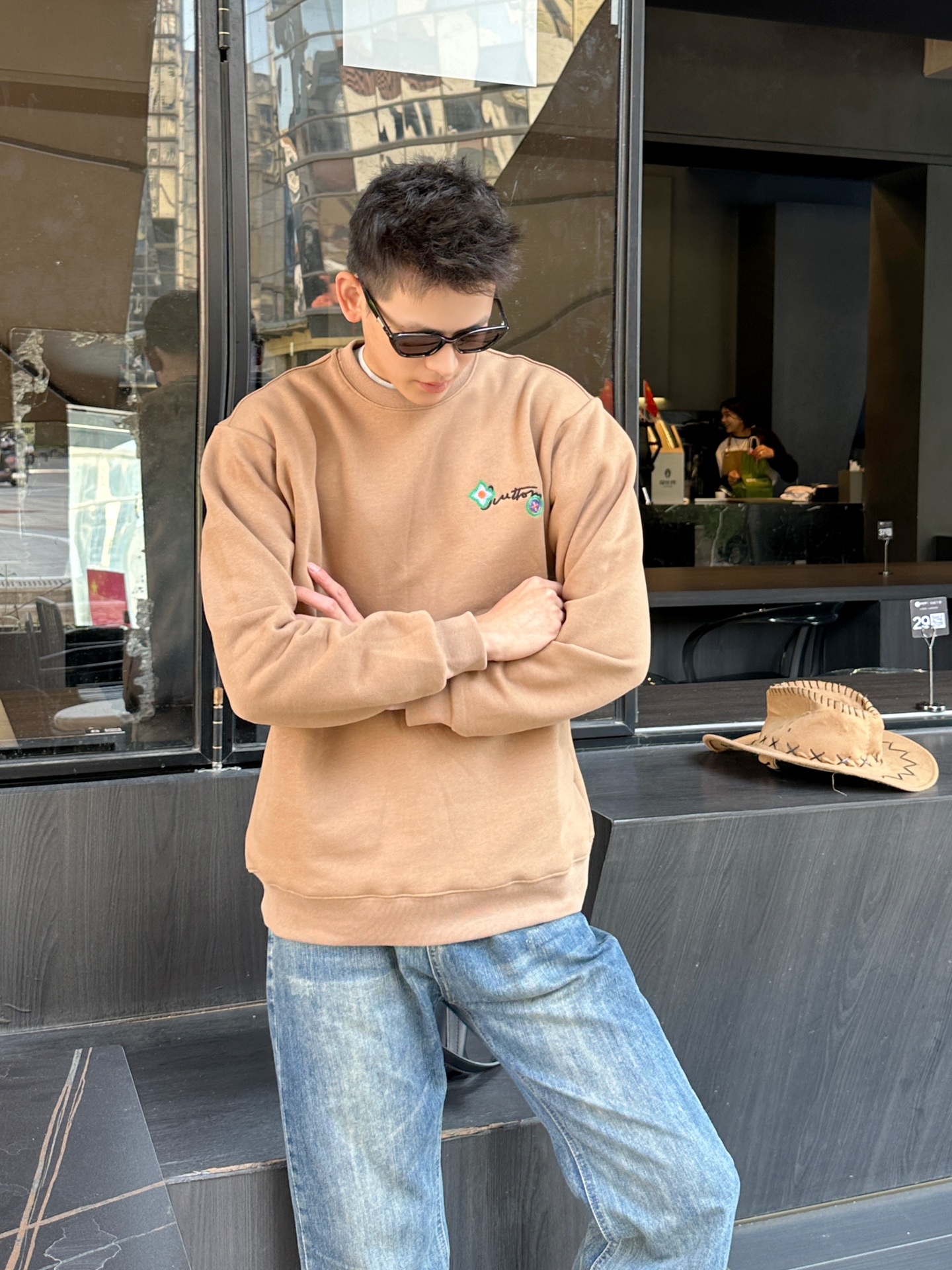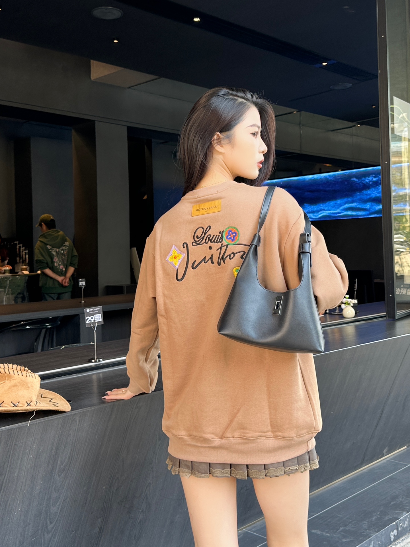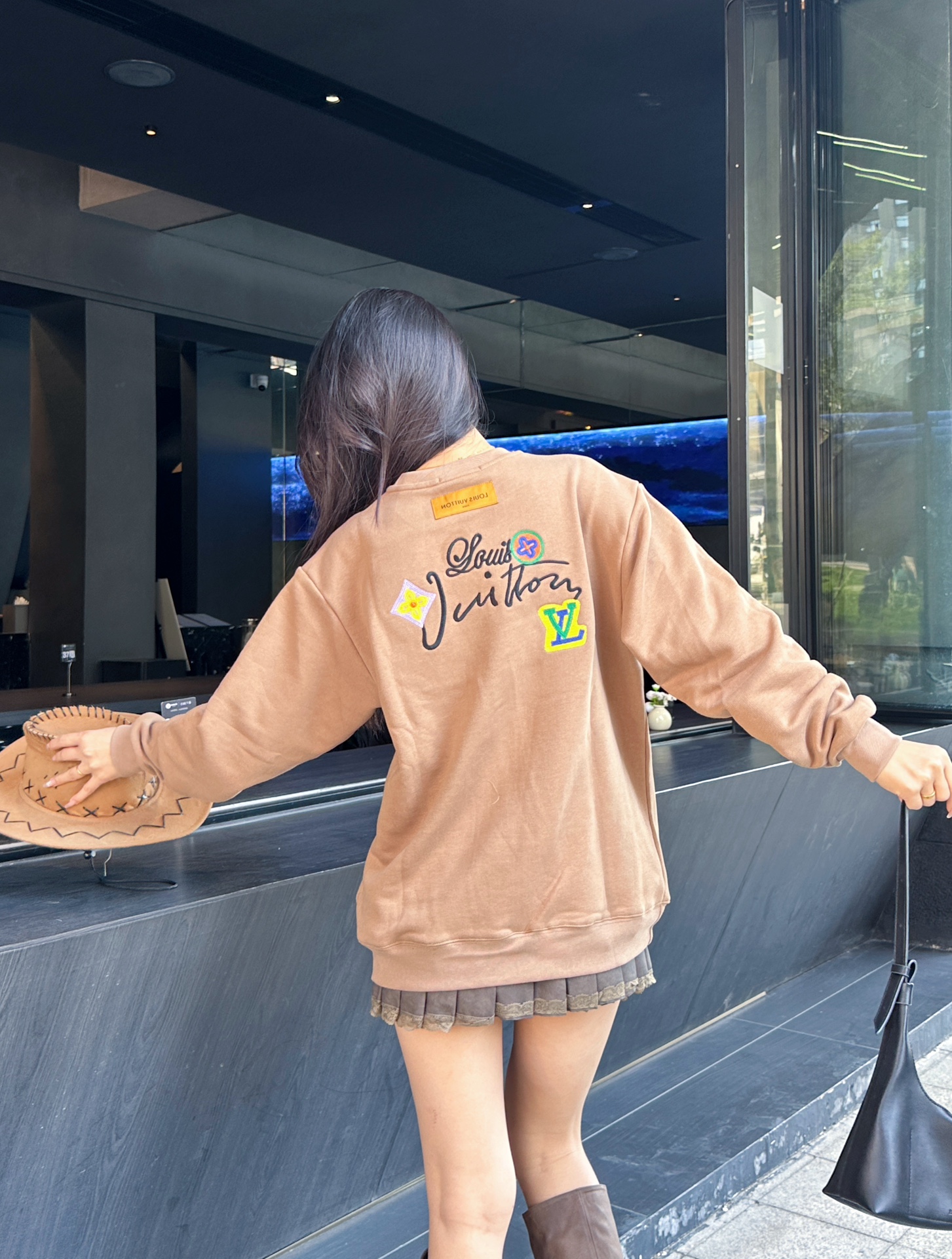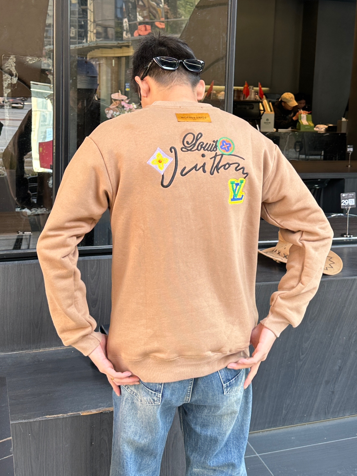 The wearing effect of the Louis Vuitton 24Fw floral letter embroidered round-neck sweatshirt #