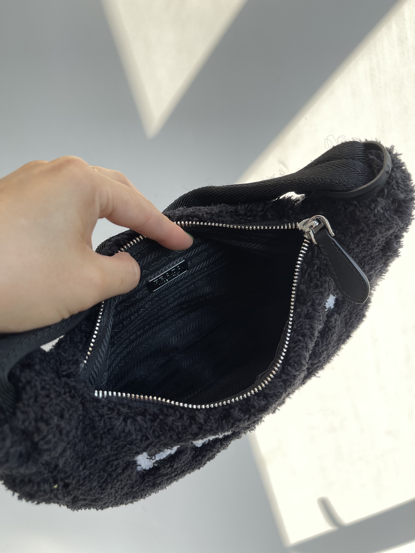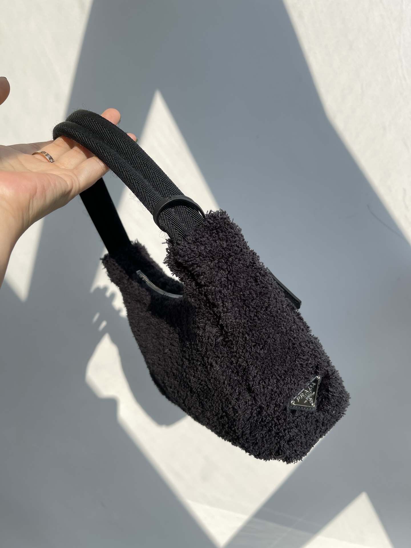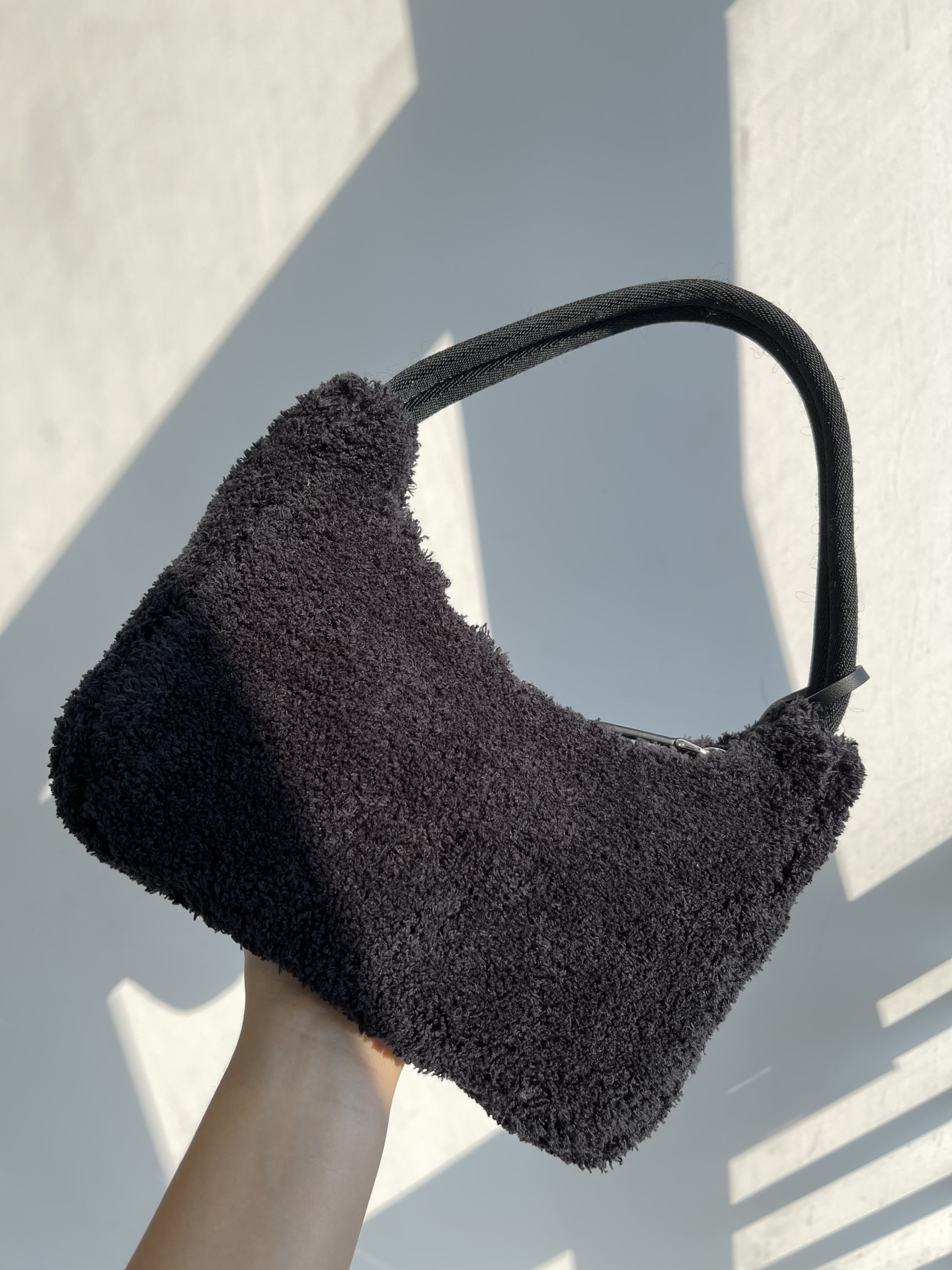 Prada 21s women's new 2000 wool loop fabric underarm single-shoulder bag. The bag body is made of soft loop fabric material. The touch is so good. It's fluffy and the soft and sticky texture is super comfortable. The brand's letter Logo is embroidered and engraved on the front, showcasing the brand's signature elements. The side is coated with an enamel metal triangular logo. The zipper opening and closing design features a Prada logo fabric lining inside. It has sufficient capacity and is lightweight and portable. The nylon webbing handle looks great when carried under the armpit or by hand. It's a great choice for commuting, going out, or even for daily dates and shopping. It's both fashionable and good-looking when going out. Recently, some of Prada's new models have perfectly interpreted the sweet and cool style, which is simply amazing. They are the new favorite of fashionista and another bestseller recommended by Internet celebrities. They are super versatile and good-looking. Fashionista must buy them. Size: 22X12X6cm nNumber: #63738350