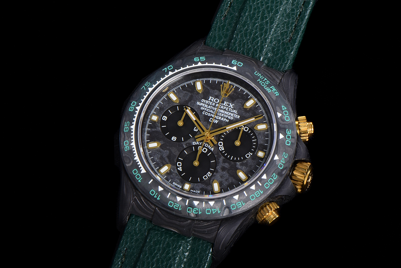 The carbon fiber custom version of the ROLEX Cosmochronograph Daytona series is presented. The watch is not only lightweight to wear but also has a tough appearance. And each wristwatch features a unique carbon fiber pattern.