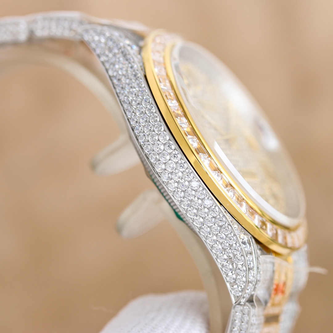 The all-new ROLEX Full Diamond Log is now available with a bang!! The dial diameter is 41mm. It is equipped with a zero-repair 2824 fully automatic mechanical movement, a Mohs grade 9 sapphire glass mirror, and 18k nano vacuum electroplating that will never fade! Brand new full-diamond original watch strap, with a unique square diamond set in the middle, making it shine extremely well under the light! The entire case and both sides of the strap are set with Swarovski crystal diamonds (with over 2,400 diamonds set by hand, not the common diamond-encrusted technique on the market!) Its technological process is very complex and the quality is guaranteed. This gift with a good reputation is highly recommended and worth owning!!
