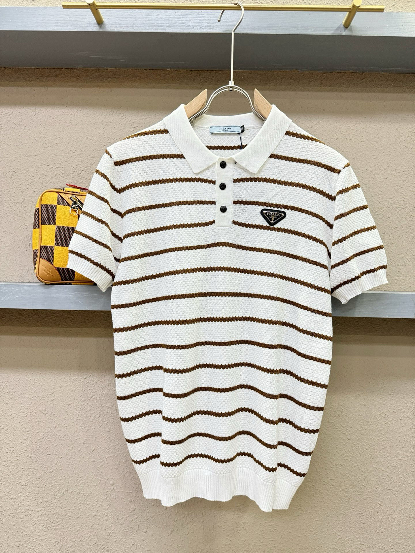 PRADA's Spring/Summer 2025 new knitted short-sleeved shirt, made of imported knitted fabric, has a soft touch. Top-quality imported private goods, fashionable design and trendy short-sleeved knitted sweater, without doubt luxurious quality. The wearing effect is excellent. The same style as the official website of luxury! Size: M-4XL