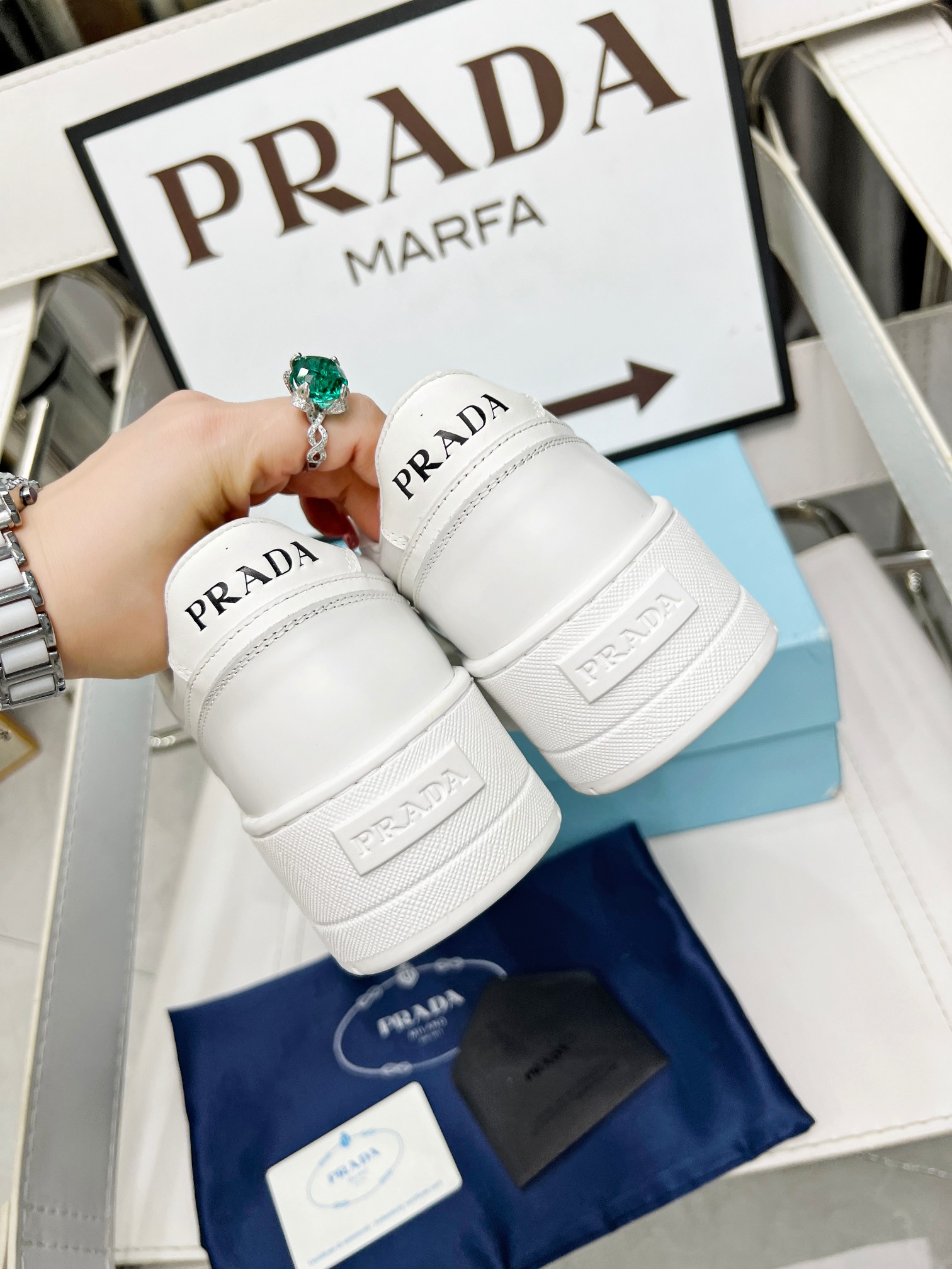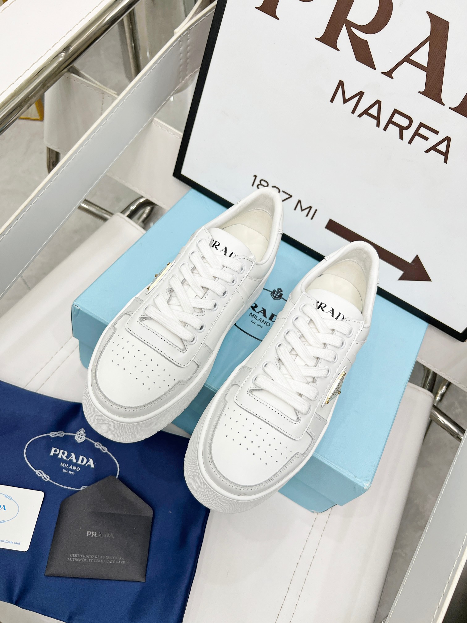 ???? Prada Prada "Panda color" thick soles white sneakers Casual sneakers This sneaker continues the timeless silhouette and elevates the style with a light design, featuring a triangular buckle logo and a 5CM thick sole Suitable for all seasons, it can be paired with various casual looks. In an era when all kinds of styles are eye-catching, the white sneakers are the ones that can last the longest and gradually capture people's hearts. Leather material: Original edge-cut beads + calfskin combination Inside: Inside the sheepskin Shoe label: Enamel-coated triangular metal logo Size :34-41